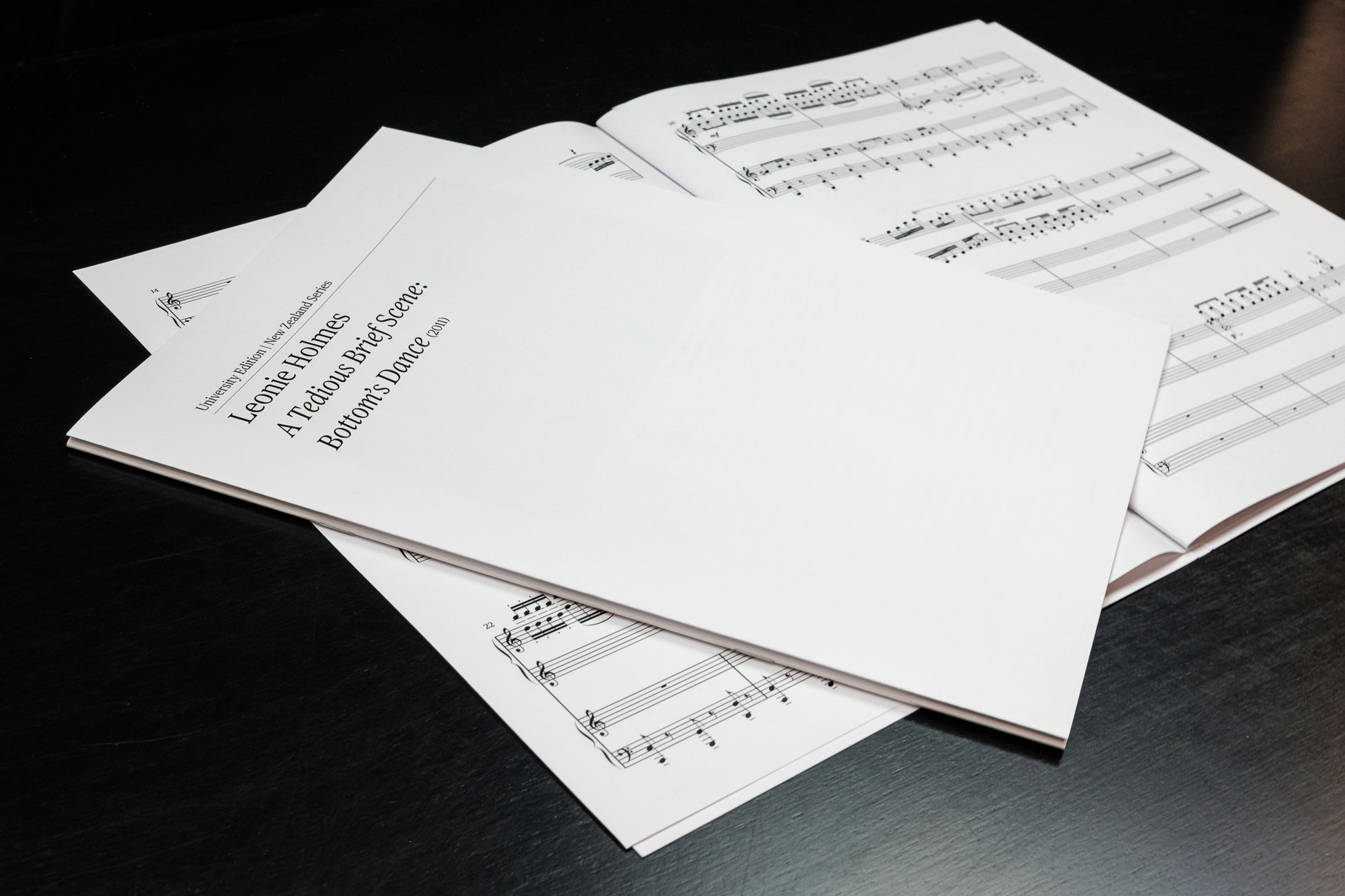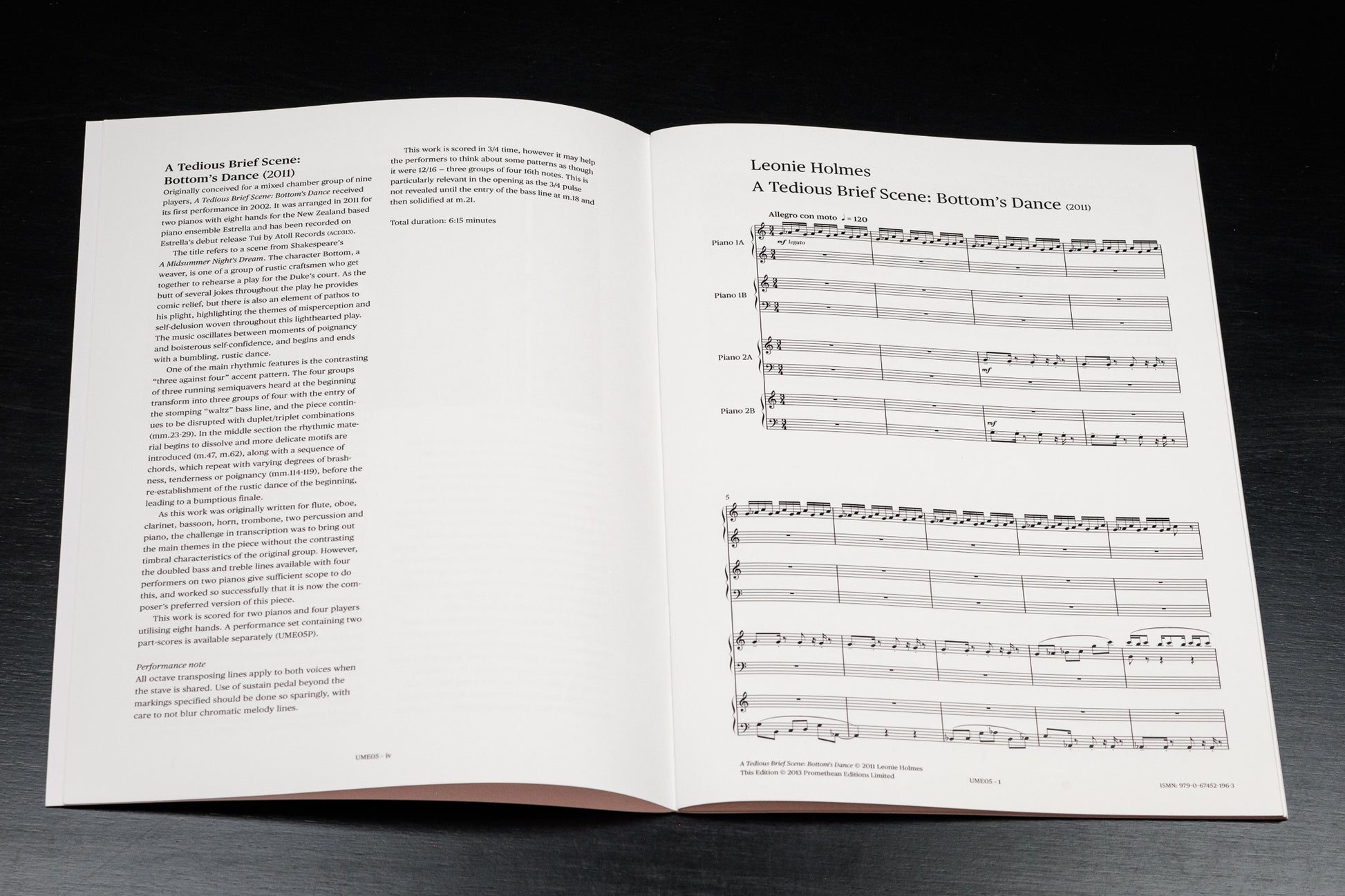 A Tedious Brief Scene: Bottom’s Dance (2011) is a fine example of Holmes’ work from her career as a composer and educator in New Zealand for over 25 years. Holmes was inspired to depict the character Bottom from Shakespeare’s A Midsummer Night’s Dream in writing this lighthearted work. It is highly engaging and energetic with elements of minimalist techniques of layered melodic ostinati, and jazz-influenced and non-tonal harmony.
