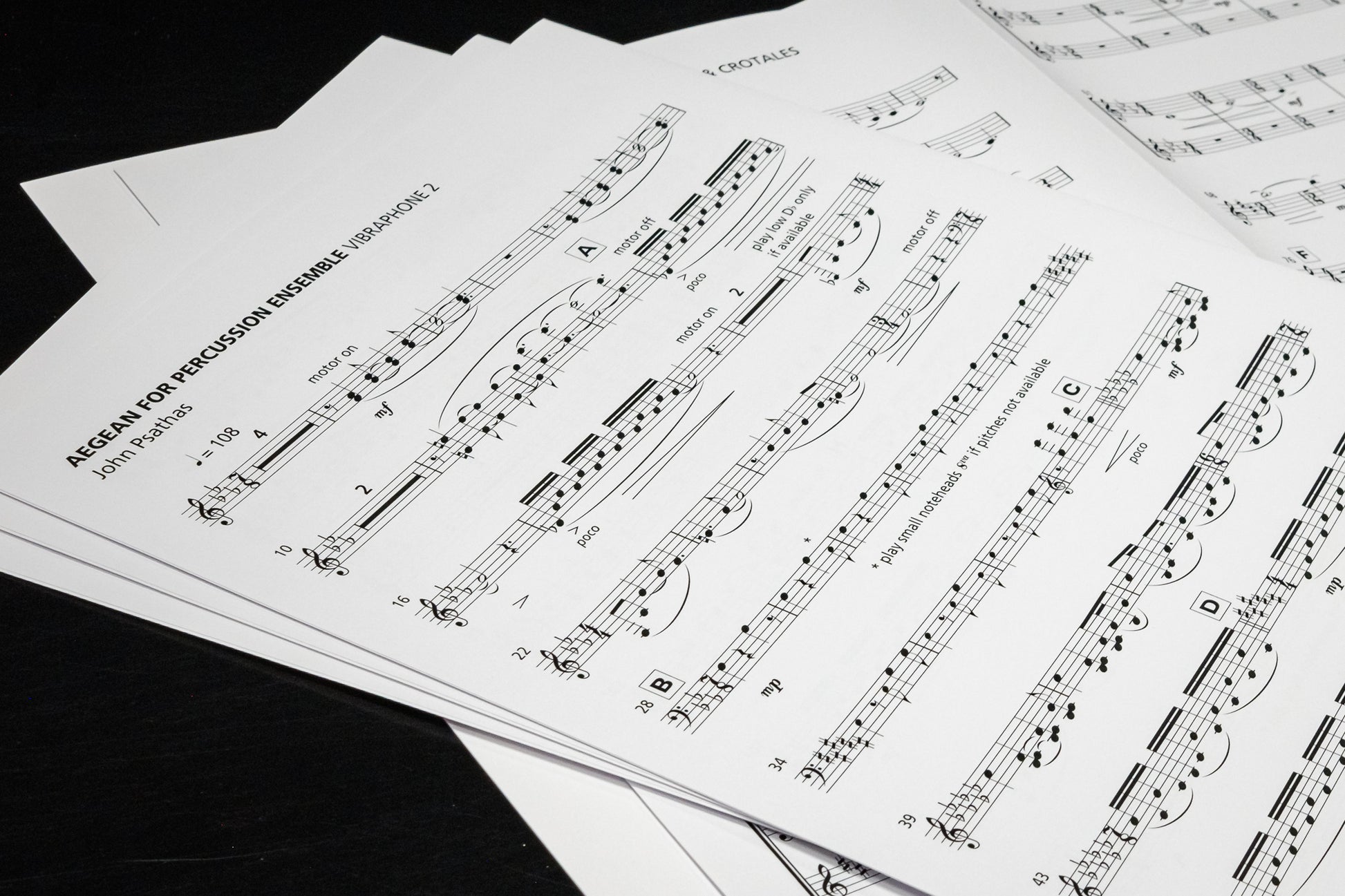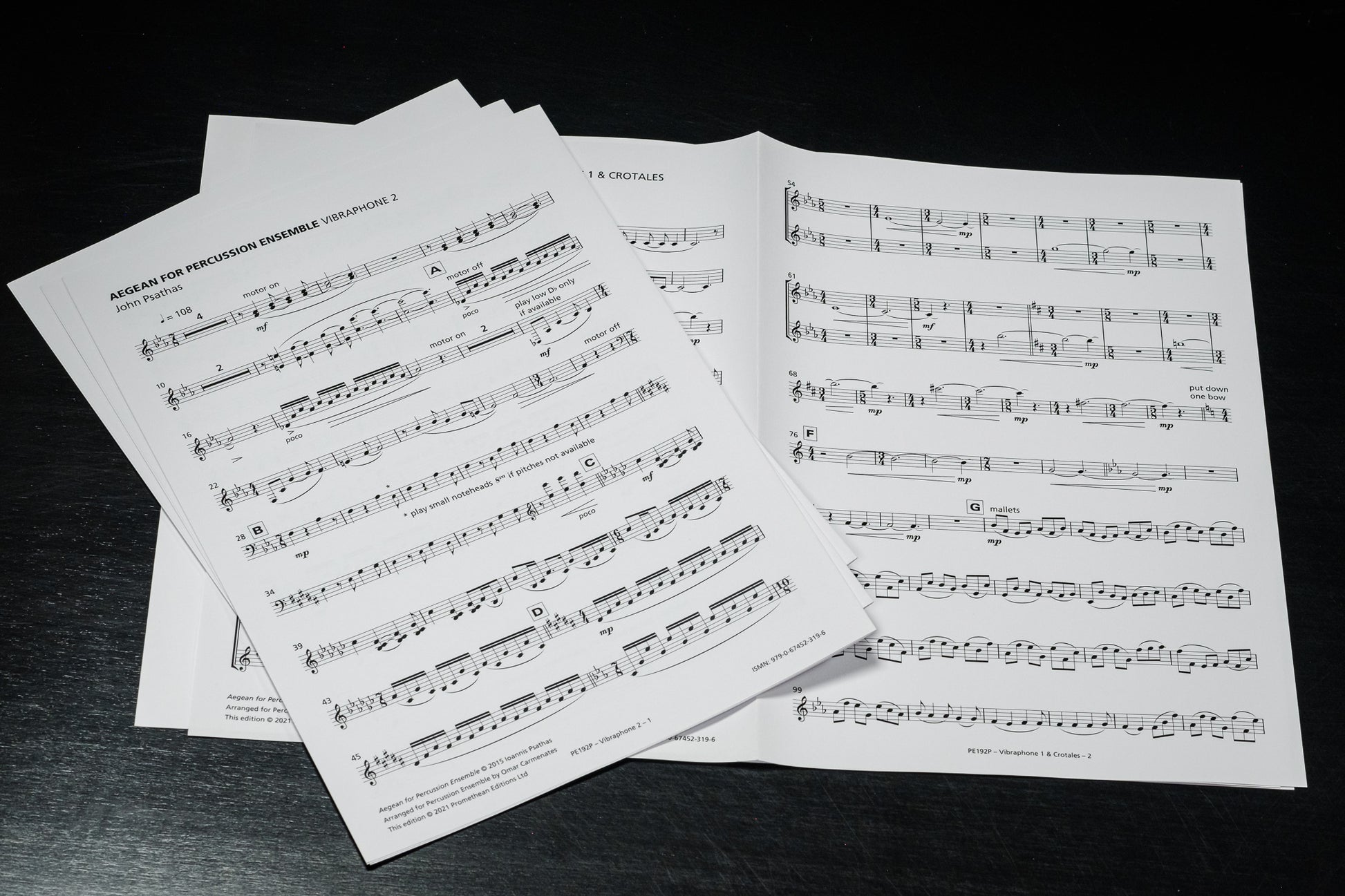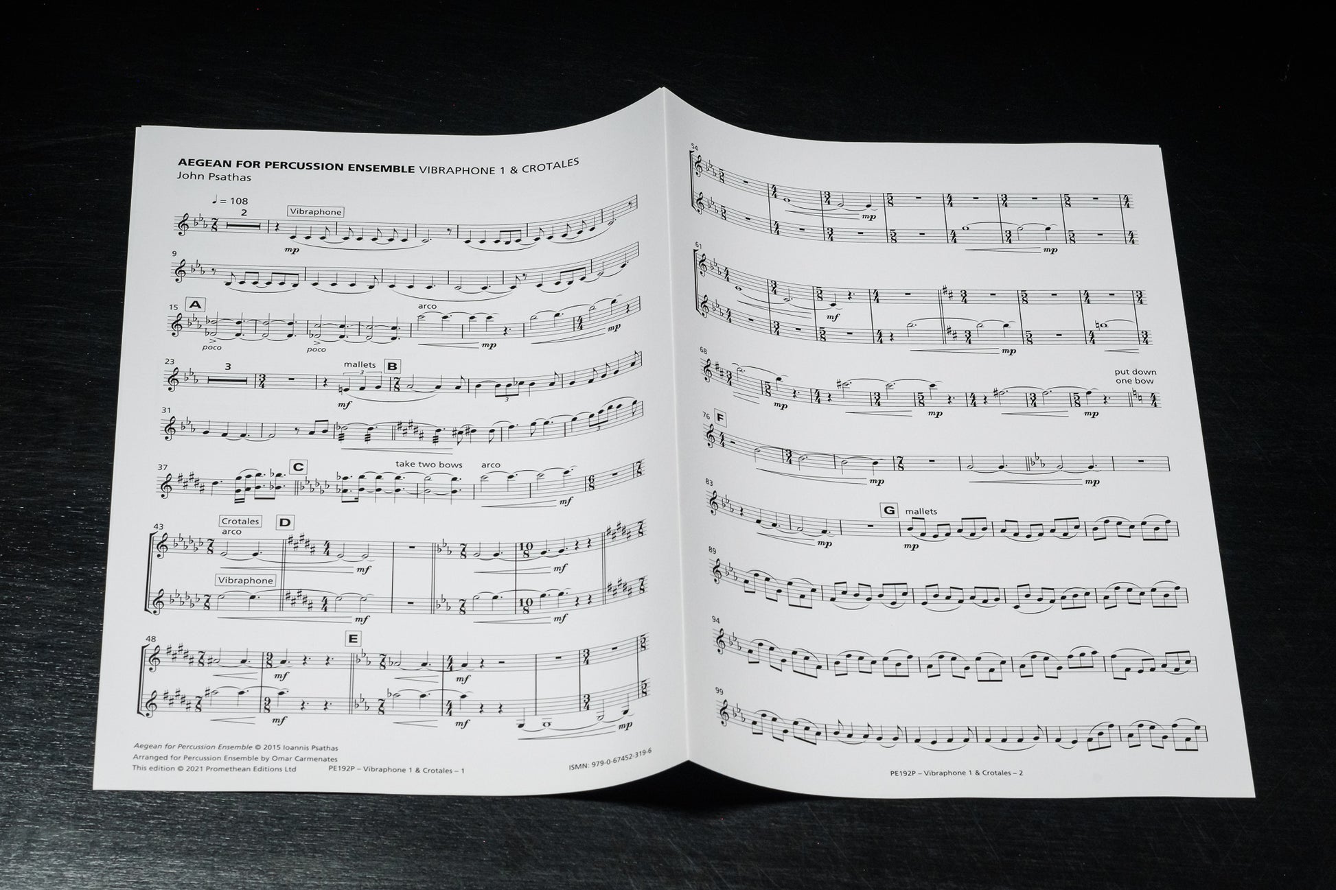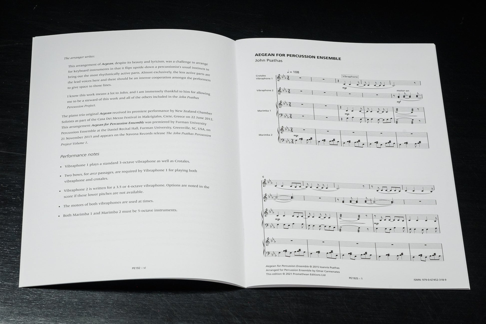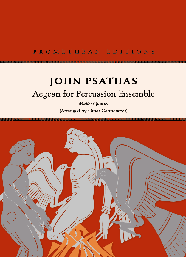 This work is an arrangement for Percussion Ensemble of Psathas’ piano trio Aegean (PE181), written in 2012. Short and elegant, Aegean is perfect for ensembles wishing to add a dose of romance to a concert programme. The work is inspired in part by the view from the composer’s parents’ house, which overlooks the Aegean Sea. Arranger Omar Carmenates makes excellent use of timbre in this arrangement, as the vibraphones’ shimmering resonance and the marimbas’ warm earthiness readily evoke the aqueous, sunlit contours suggested in the original version.
