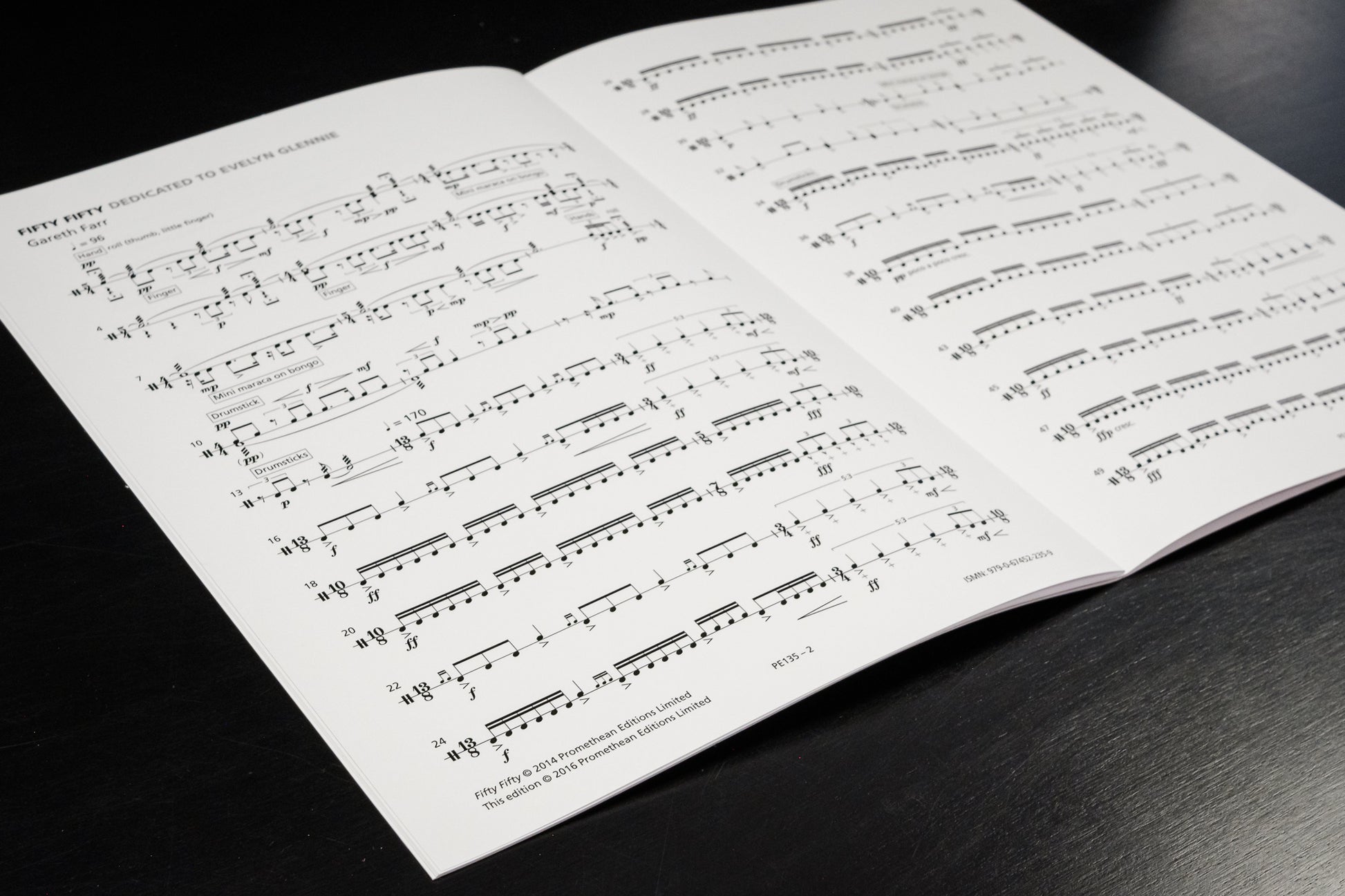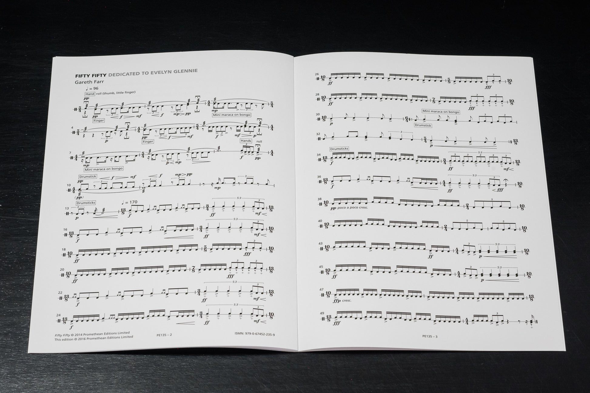 Pint-sized yet power-packed, Farr’s Fifty Fifty for solo bongos was composed at the request of Dame Evelyn Glennie as part of her 50 for 50 project. Farr injects a range of playing techniques into this 50-bar work – drumsticks and a mini maraca come into play alongside more conventional hand and finger work in articulating rapid-fire passages that twitch with tumbling accents. Rhythmic subversion even dominates the more spacious snatches of time, making this work an enjoyable challenge for accomplished percussionists.