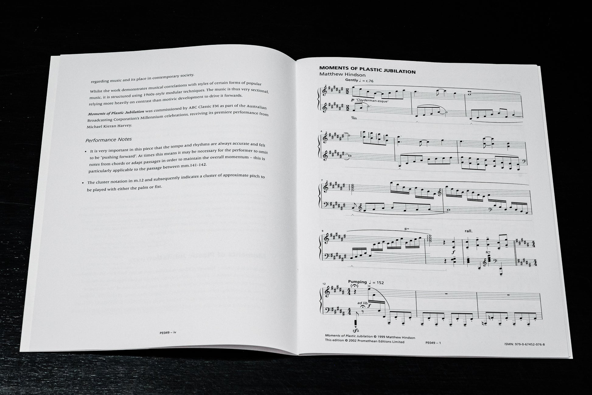 Moments of Plastic Jubilation takes its title from a newspaper critic’s outrage at the composer’s adoption of stylistic elements of techno music in his orchestral work SPEED. Whilst the work demonstrates musical correlations with styles and forms of popular music, it is structured using 1960s-style modular techniques. The music is thus very sectional, relying more on contrast than motivic development to drive it forward. It is an energetic and virtuosic addition to any piano recital.
