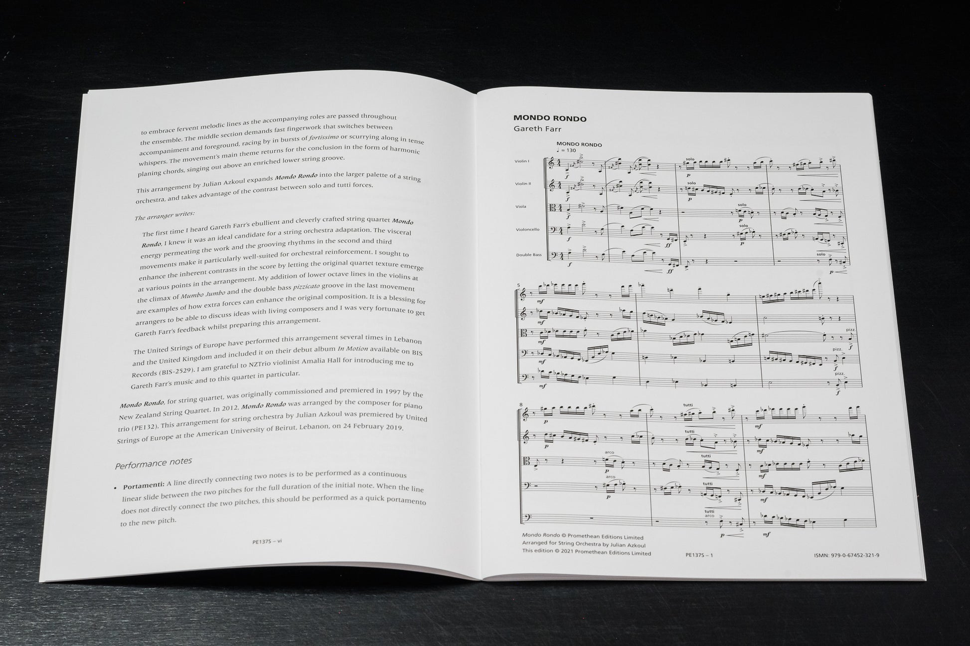 Arranged for string orchestra by Julian Azkoul, artistic director and leader of the United Strings of Europe, Farr’s quirky and clever Mondo Rondo is right at home in this larger setting. The visceral energy and grooving rhythms in the second and third movements are particularly well suited for orchestral reinforcement, while its hocketting pizzicato and subtle body percussion passages are made all the more dynamic in this context.