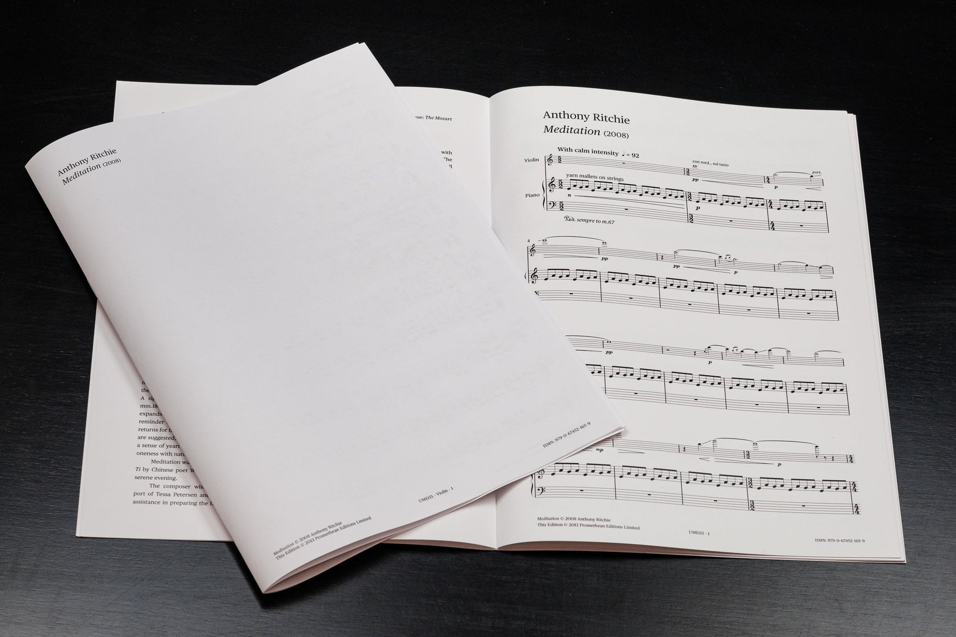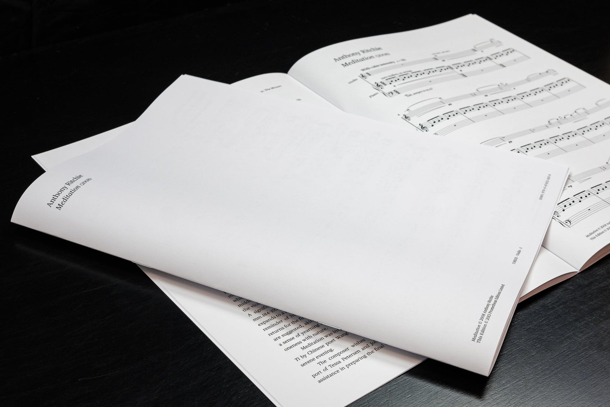 Meditation is inspired by traditional Chinese folk music and poetry, and demonstrates Ritchie’s ongoing interest in exploring folk music traditions as a basis for creating new works. The violin part exploits expressive glissandi and high harmonics that recall the sound of the erhu, a bowed Chinese string instrument. Ritchie’s use of pentatonic modes and simple melodies throughout the work also evokes this influence.