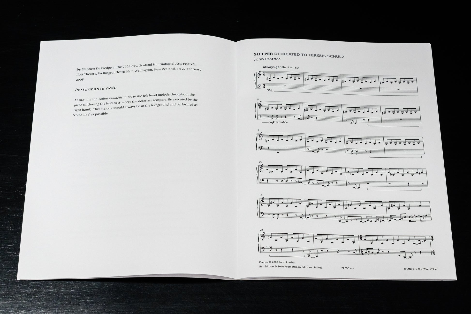 Sleeper was commissioned by the James Wallace Arts Trust for pianist Stephen De Pledge, as part of his programme of works by New Zealand composers, collectively titled Landscape Preludes. De Pledge first performed and presented this programme at the New Zealand International Arts Festival on 28 February 2008.