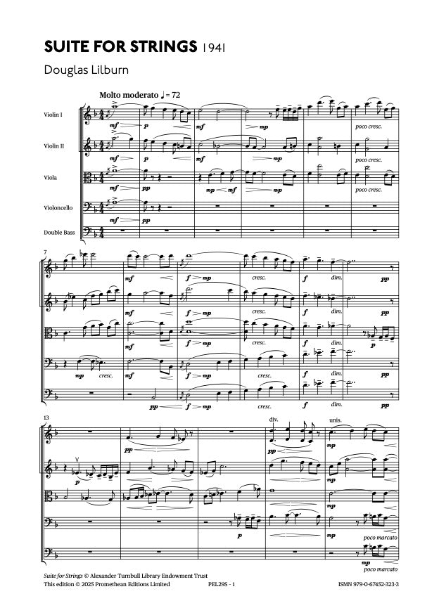 Having unaccountably fallen into neglect since its first one or two undocumented performances in the 1940s, the Suite for Strings can with this publication at last be assessed as the assured and confident work of a young composer finding his footing at home after study abroad. It is identifiably the first signpost towards the Allegro for Strings, Landfall in Unknown Seas and Diversions, three mature works for string orchestra that would seal Lilburn’s future as the foremost New Zealand composer of his generation. The five movements are written in a comfortably approachable idiom redolent of the work of early mid-twentieth century English composers, making this an ideal addition to the repertoire of smaller and school orchestras.