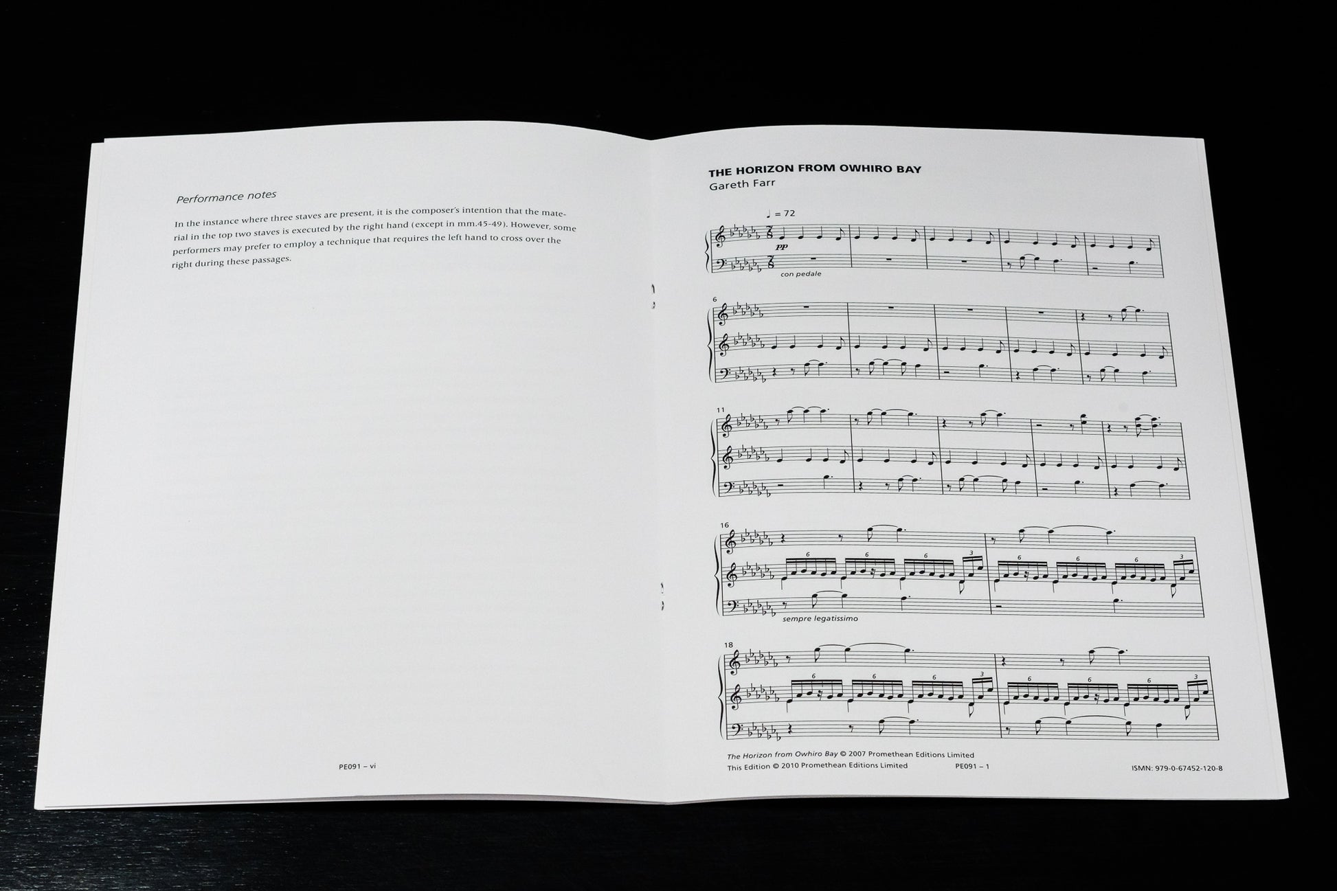 The Horizon From Owhiro Bay (2007) will appeal to pianists keen to build up an eclectic repertoire, as this work integrates Javanese slendro musical systems and stylistic elements associated with the French impressionist composers. A musical depiction of the “moody depths” of New Zealand’s Owhiro Bay and Cook Strait, its simple arching structure begins and ends with a repeated two-note motif, which serves as a literal horizon as the pianist performs surrounding ascending and descending figures.