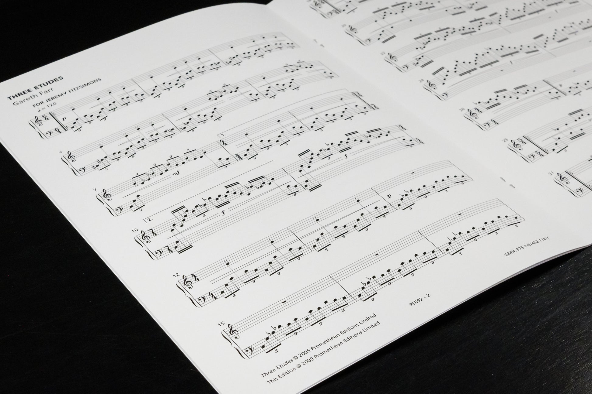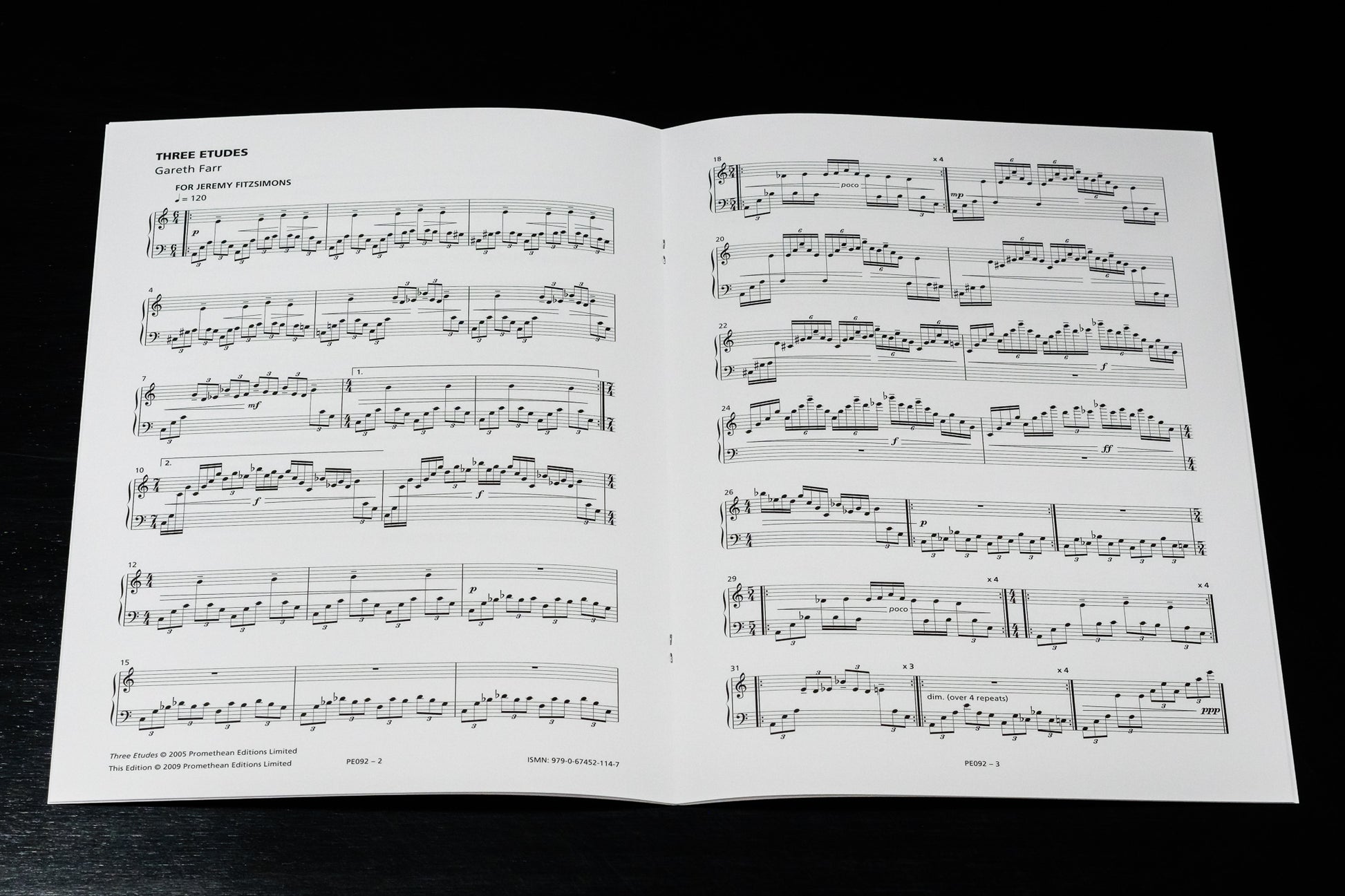 Three Etudes was composed whilst Farr was still performing regularly as a marimba soloist. Movements II and III were written for fellow percussionists Jeremy Fitzsimons and Suzanne Warner respectively, and the first movement was taken from Farr's title theme music for the New Zealand television series Duggan.