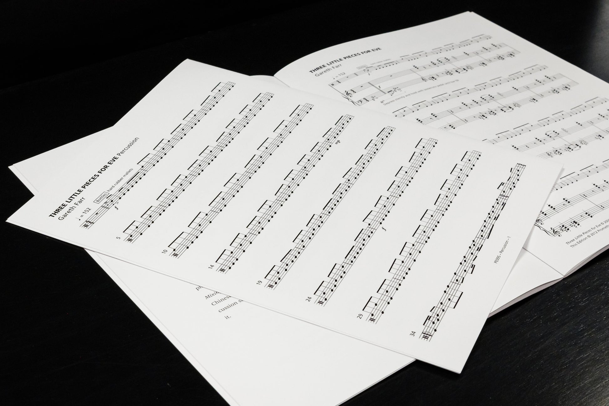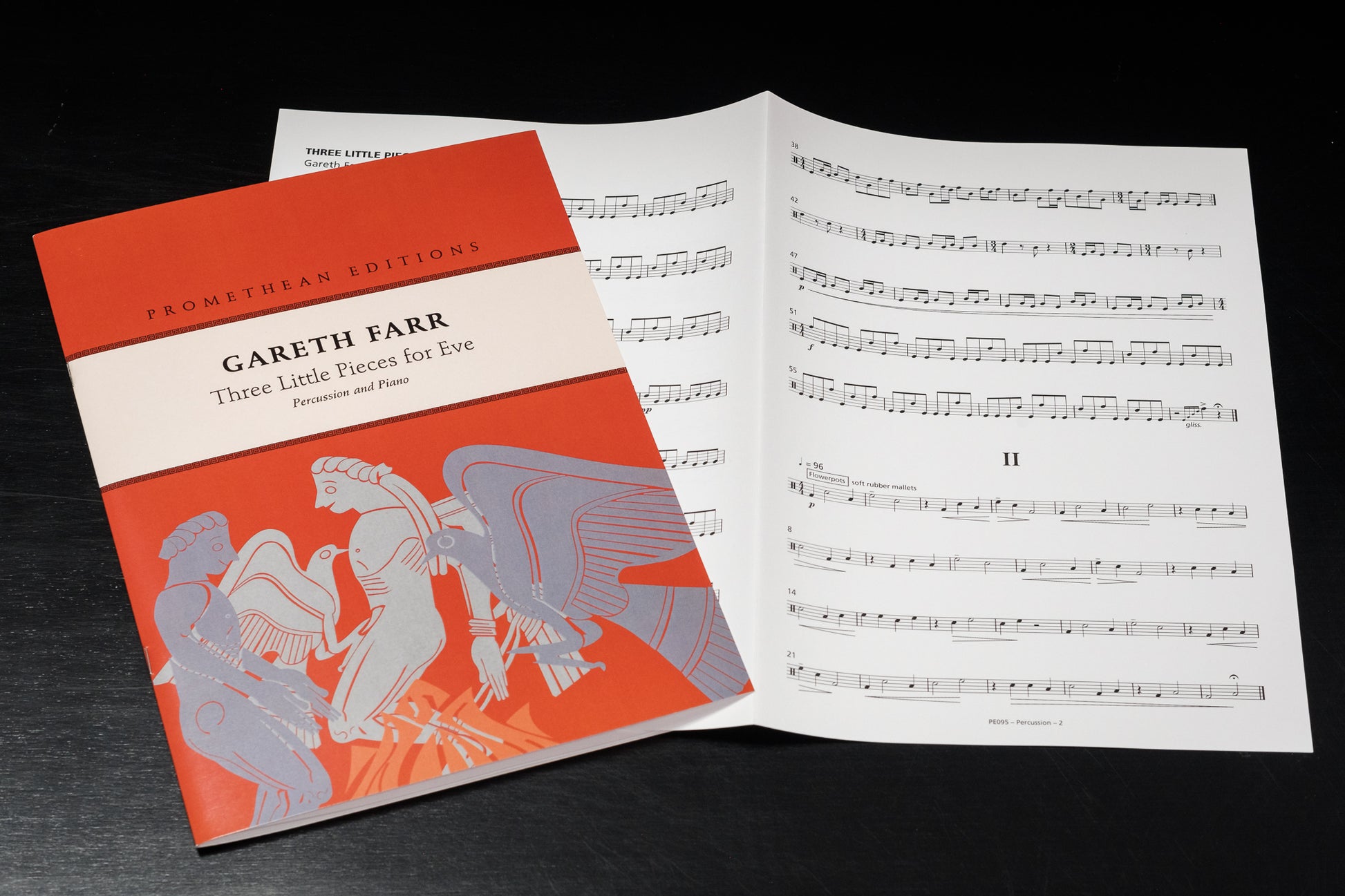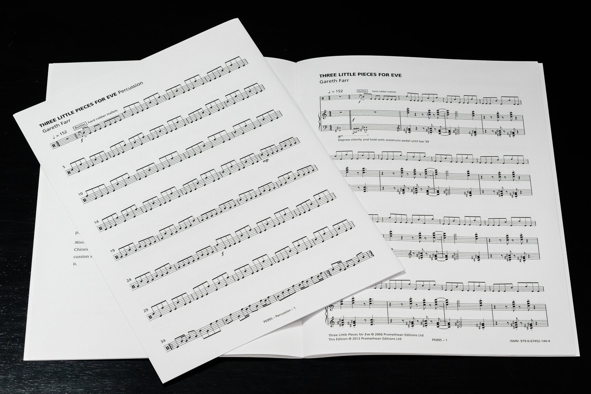 “Serious fun” is the best way to describe Three Little Pieces for Eve (2006). It is a lively and entertaining set of three contrasting pieces in which the percussionist uses household objects including bottles, flowerpots, mixing bowls and a triangle. Syncopated piano chords are stitched together by the percussion part at the outset of the work. The discordant tonal quality of the alternating chords are duly contrasted by a short repeated figure which evokes a sense of childhood playfulness.