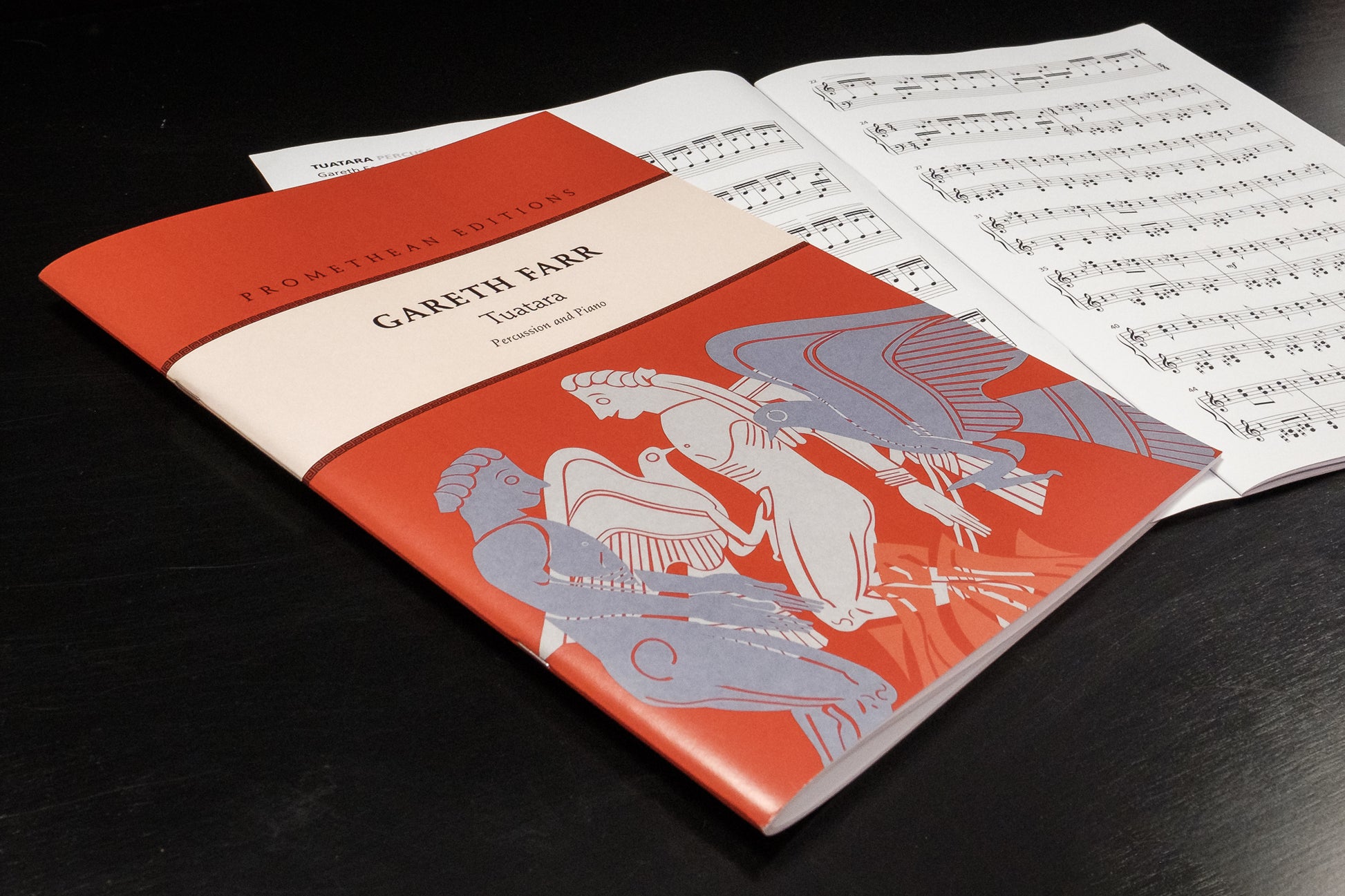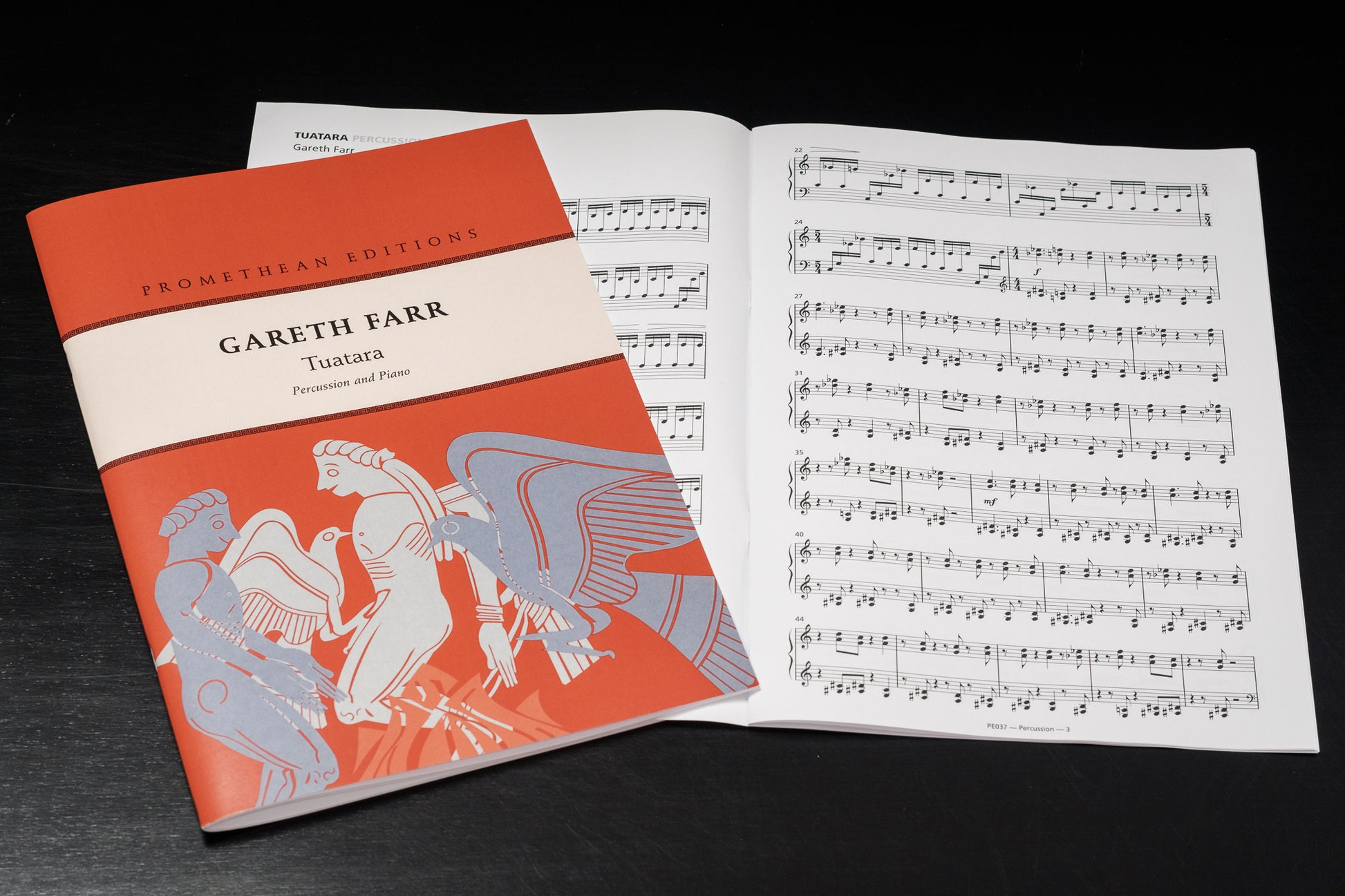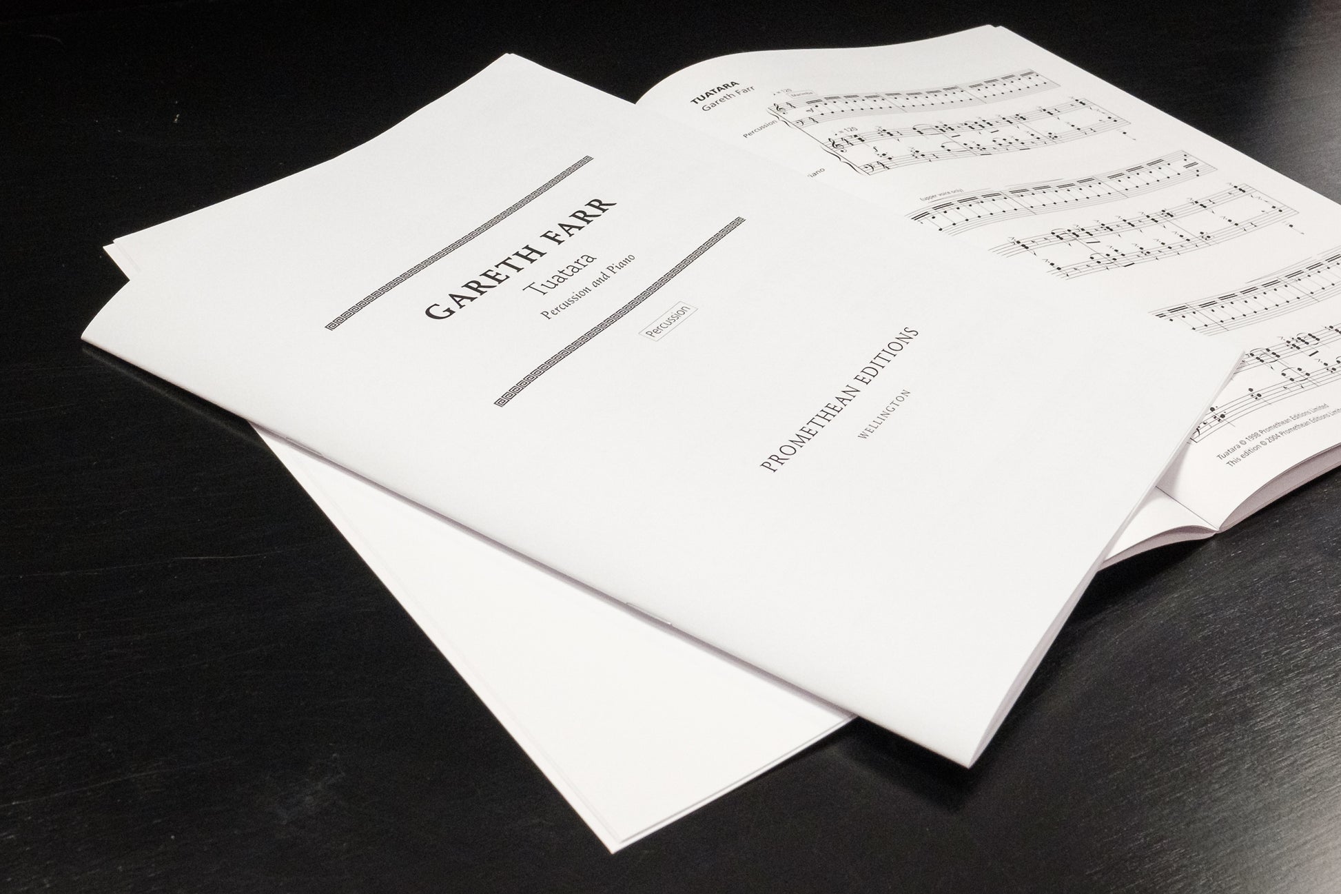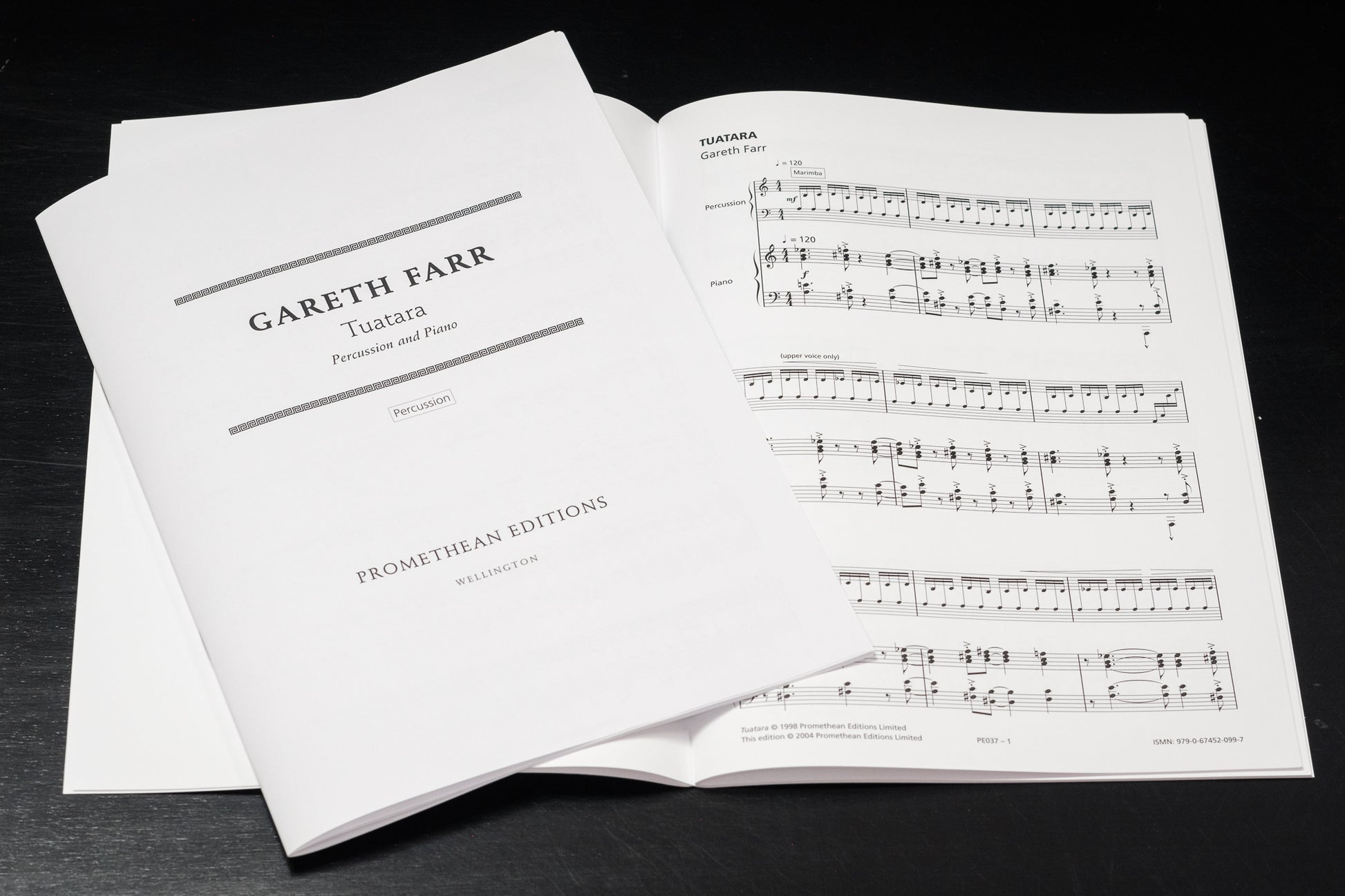 Farr’s Tuatara (1998) is an energetic and entertaining work for percussion and piano, based on two musical ideas which are heard concurrently at the start of the work. A jaunty, angular, syncopated theme in the piano part is set against fast marimba lines. The musical argument of the work is entirely derived from these two ideas, which are exchanged between the instruments and subjected to development by variation. The percussion part is enhanced through the addition of tom toms and cymbals.