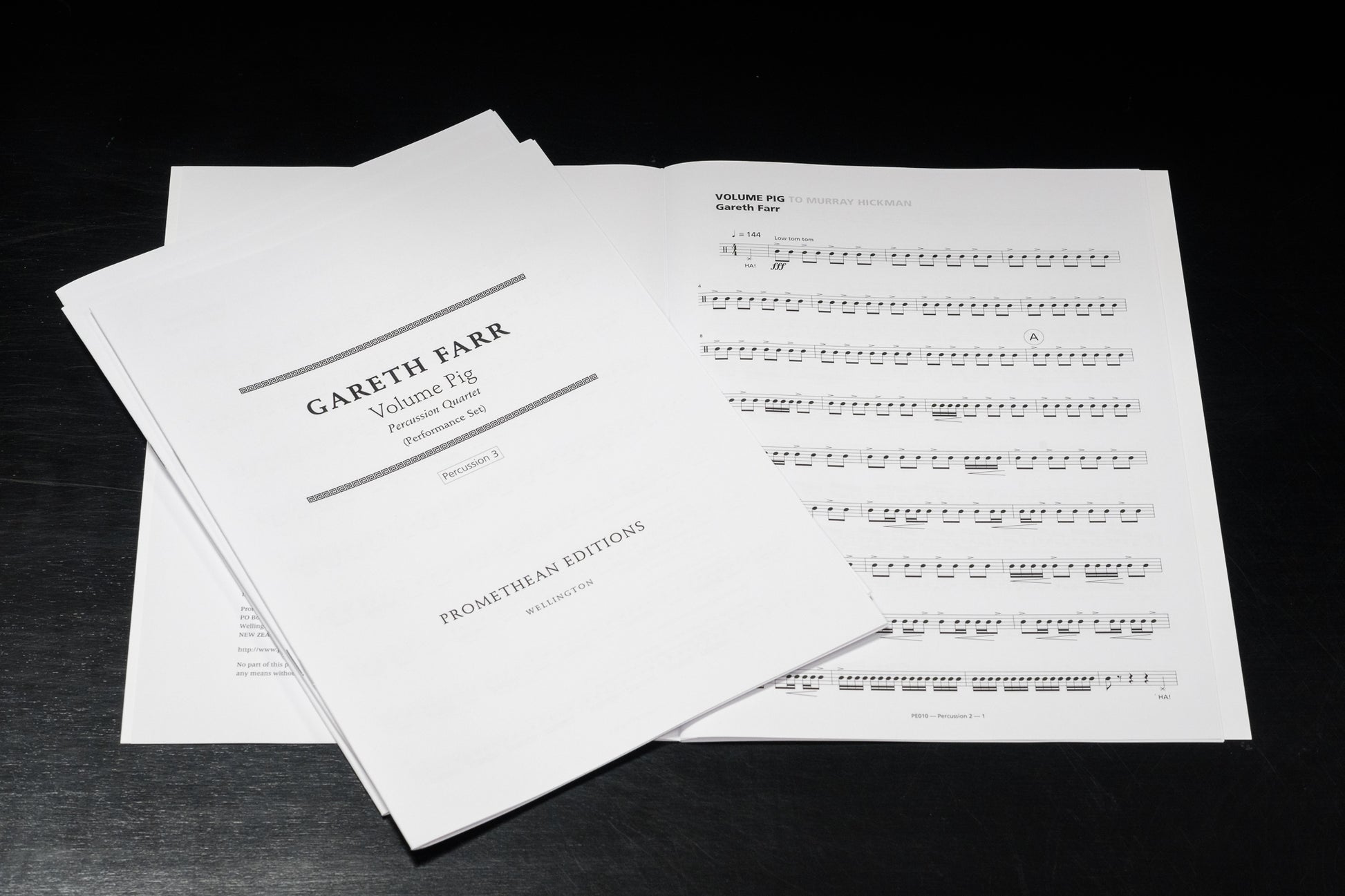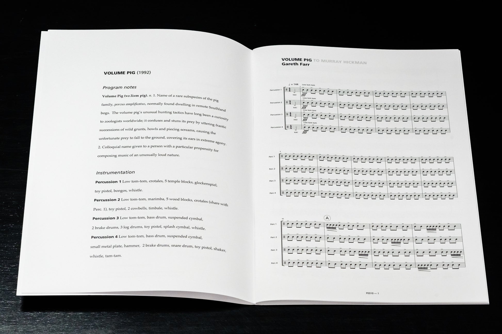 Perfect for percussion quartets seeking to add energy and theatricality to their repertoire, Volume Pig (1992) places Farr’s sense of humour alongside his formidable sense of rhythm. Dedicated to New Zealand percussion master Murray Hickman and premiered by Hickman’s STRIKE Percussion ensemble, Volume Pig shifts unpredictably between overwhelming noise and barely audible whispers, its intricate textures peppered with wild shrieks, grunts and howls.