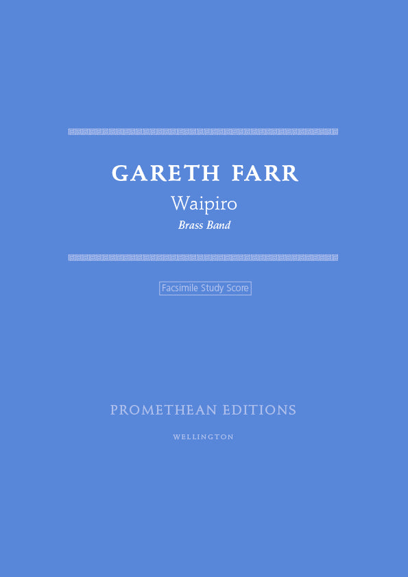 Waipiro, Gareth Farr’s first work for brass band, was commissioned by the Brass Bands Association of New Zealand as the B-Grade test piece for the National Championships in 2000. The title refers to Waipiro Bay, a picturesque site north of Gisborne on New Zealand’s East Cape; and perhaps also to the Māori word for liquor (literally “fermented water”). The work was revised in 2002.